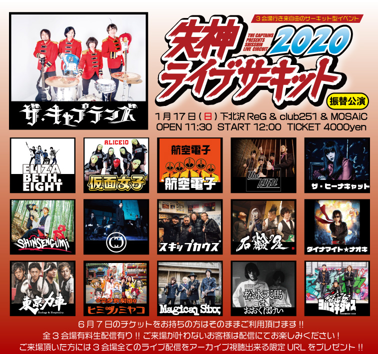 2020/10/31 admin6月7日に開催予定でありました、ザ・キャプテンズ主催公演『失神ライブサーキット2020』の振替公演が決定しました!